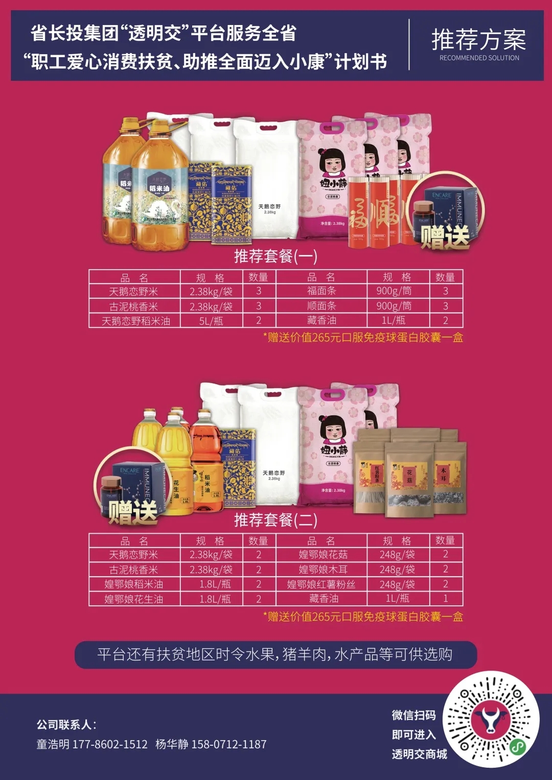 湖北粮油“透明交”电商平台扶贫专区助力省总工会“职工爱心消费扶贫”活动落实落地,专门开辟“扶贫专区”,为广大工会会员对接省内扶贫农产品,爱心支持湖北农产品,并可提供定制服务。