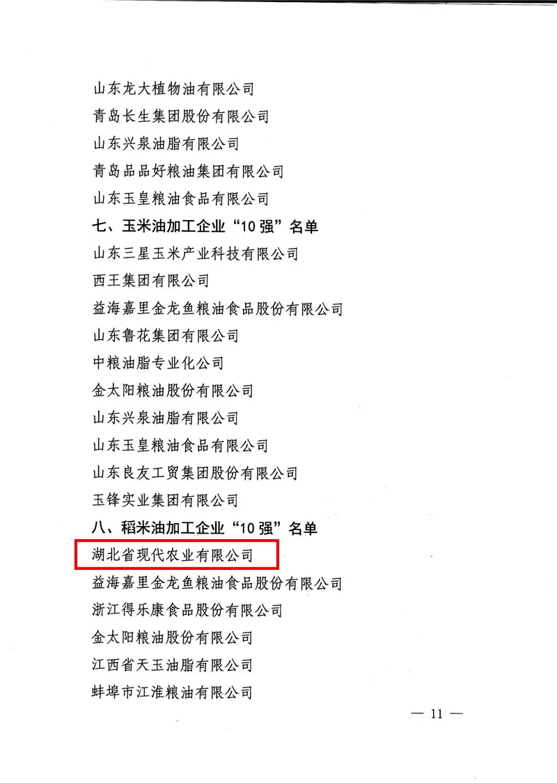 为切实保障国家粮食安全,扎实做好“六稳”工作,全面落实“六保”任务,推动粮油产业高质量发展,中国粮食行业协会开展了全国重点粮油企业专项调查。根据企业产品销售收入、产量、利润、利税等指标综合评价,中国粮食行业协会于2021年12月13日发布2020年度全国粮油加工企业50强、10强名单,涵盖大米、小麦粉、食用油等17个领域的粮油加工企业以及粮食交易市场。湖北农业发展集团所属湖北省粮油集团蝉联中国大米加工企业50强、食用油加工企业50强,旗下湖北省现代农业有限公司蝉联中国稻米油加工企业10强。具体名单如下: