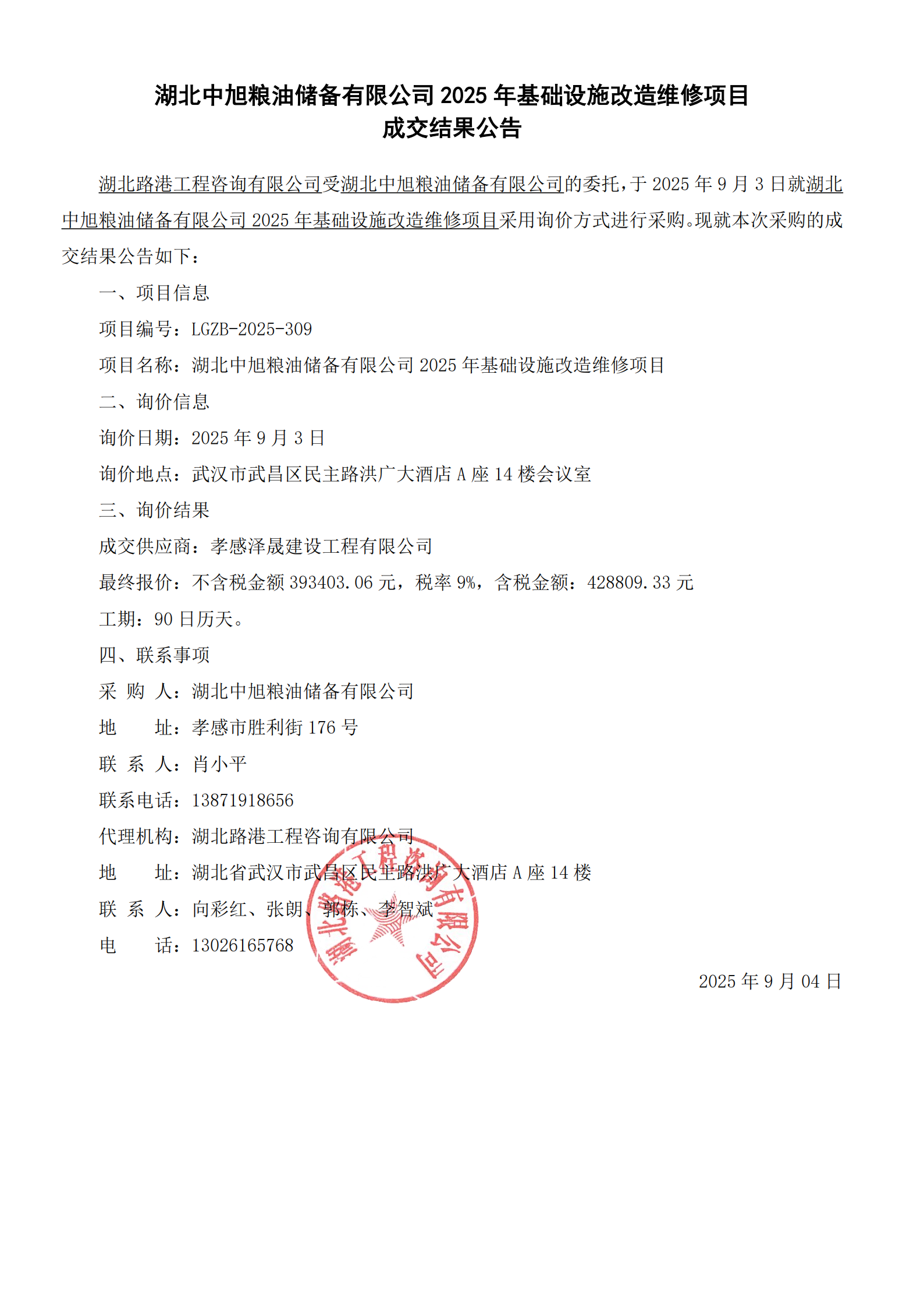 湖北中旭粮油储备有限公司2025年基础设施改造维修项目成交结果公告