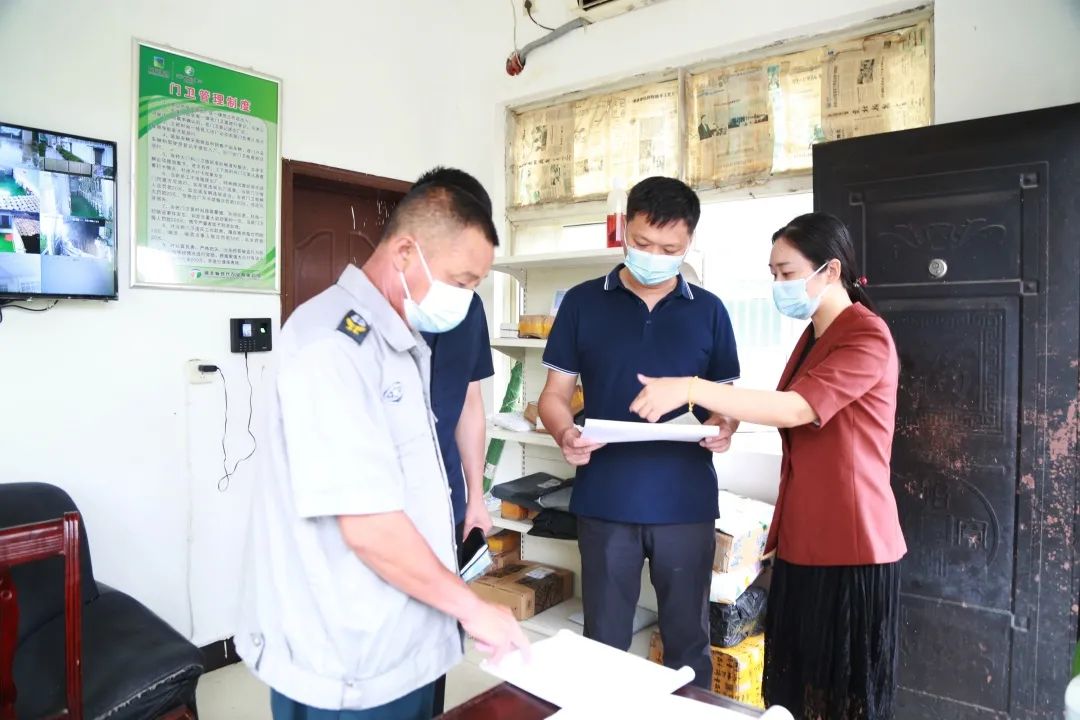 在现代农业公司,庞虎认真查看了园区疫情防控和现场管理情况,听取了现代农业公司总经理姚莎莎关于企业疫情防控和安全生产工作汇报。