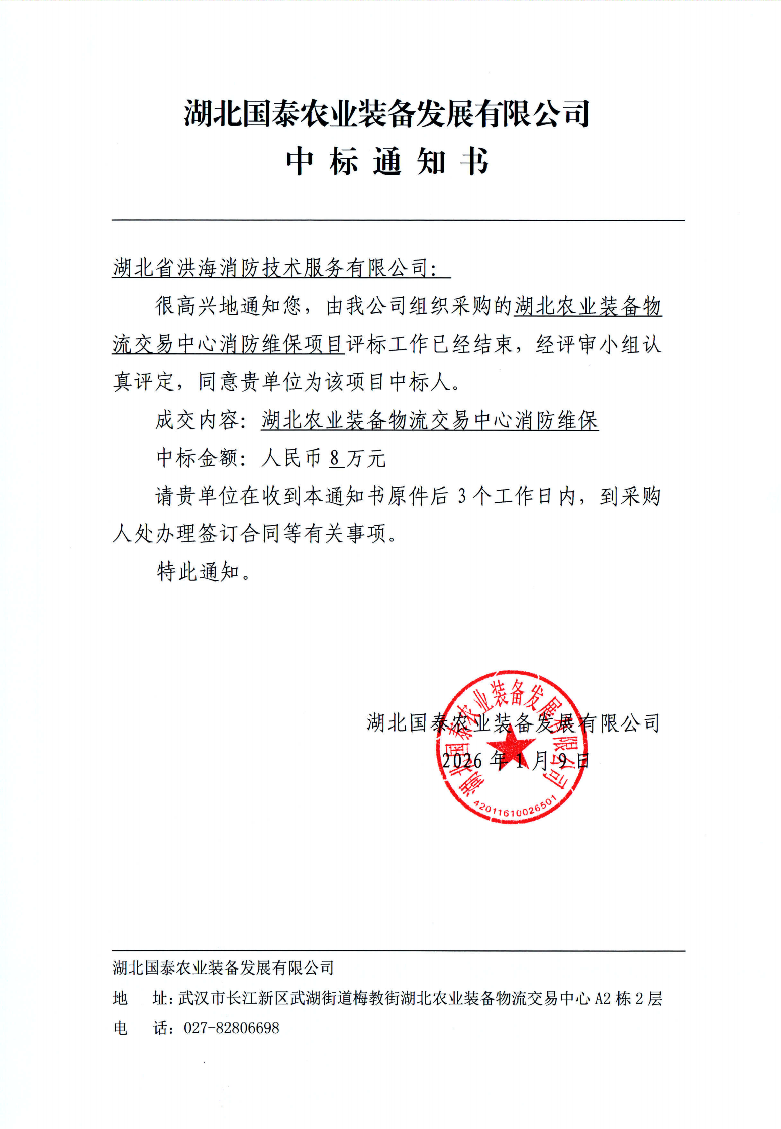 湖北国泰农业装备发展有限公司消防维保项目中标通知书